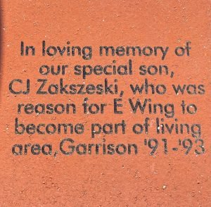 My second brick was in memory of our Special son, Charles E. Zakszeski, Jr, known as “CJ”. CJ was a quadriplegic with cerebral palsy. The Garrison had 3 bedrooms and 2 baths, which were upstairs. (only a half bath downstairs). Zak was the legal guardian of his mom and to include our other son, Stephen, we needed 4 bedrooms and one had to be downstairs as well as a bathroom.